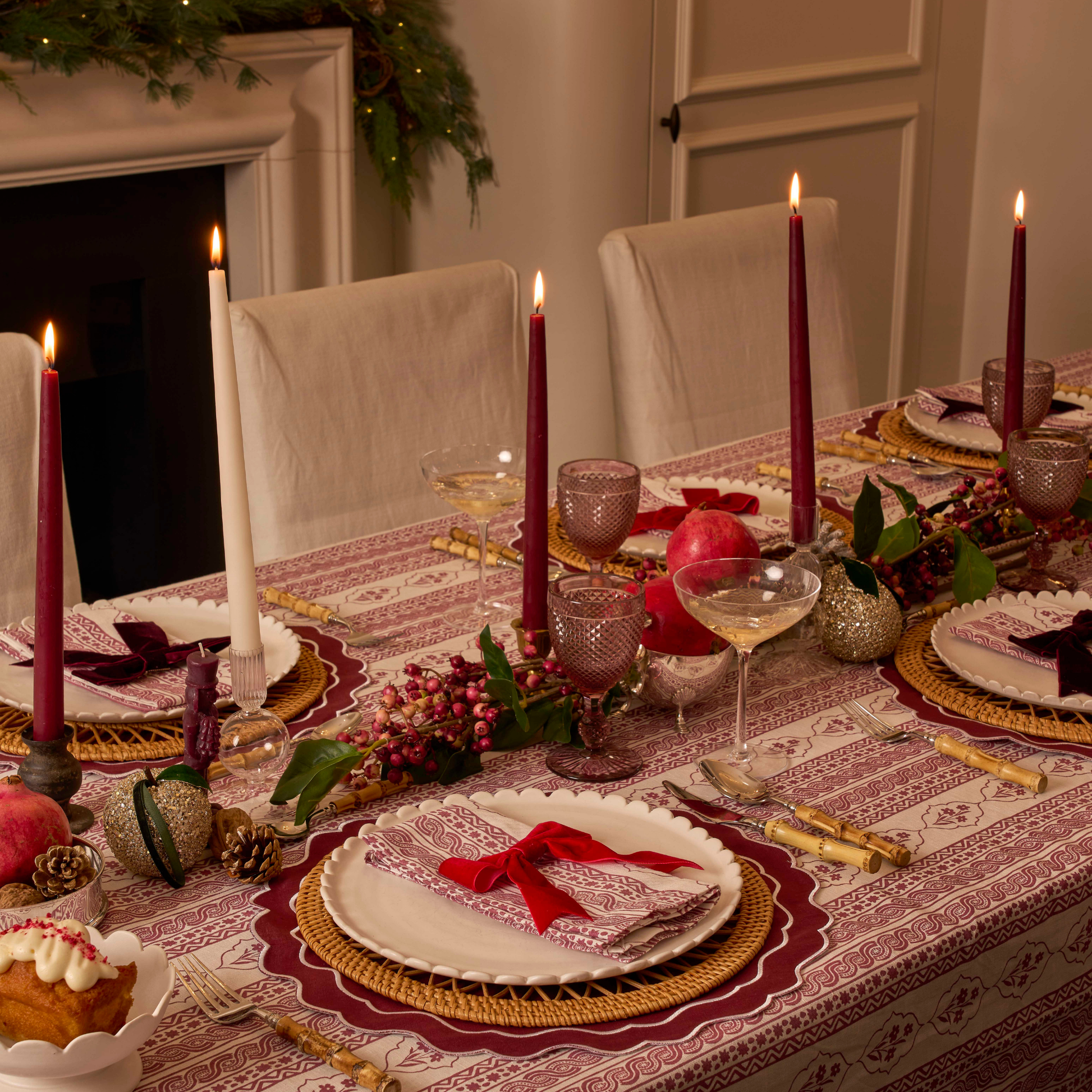 A statement piece designed to transform your table, our First Bloom tablecloth brings together Mughal-inspired florals and intricate geometric patterns in a soft ruby red. Hand screen printed by artisans in Sanganer, Jaipur, each cloth is a testament to timeless craft — beautifully vibrant, subtly imperfect, and entirely unique.