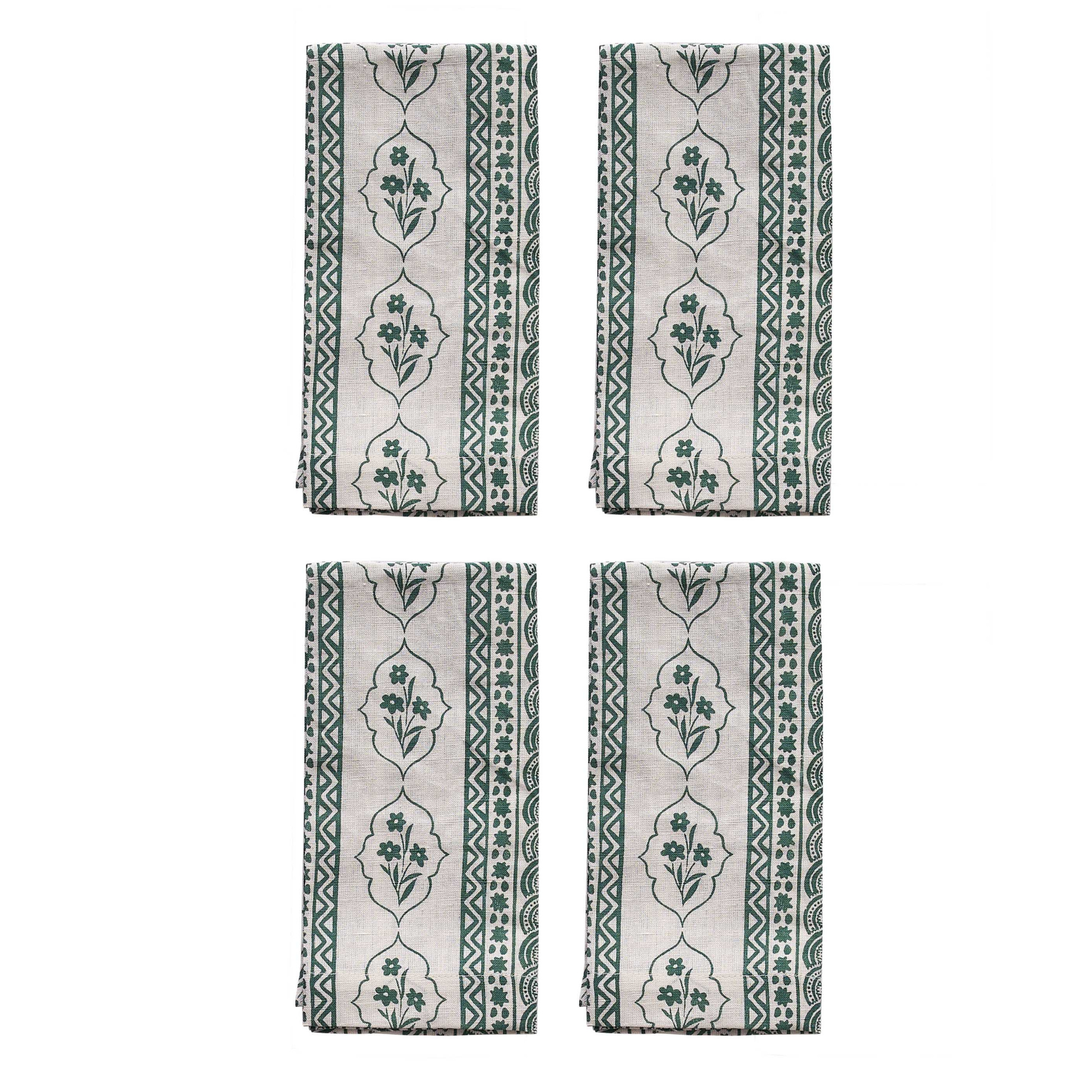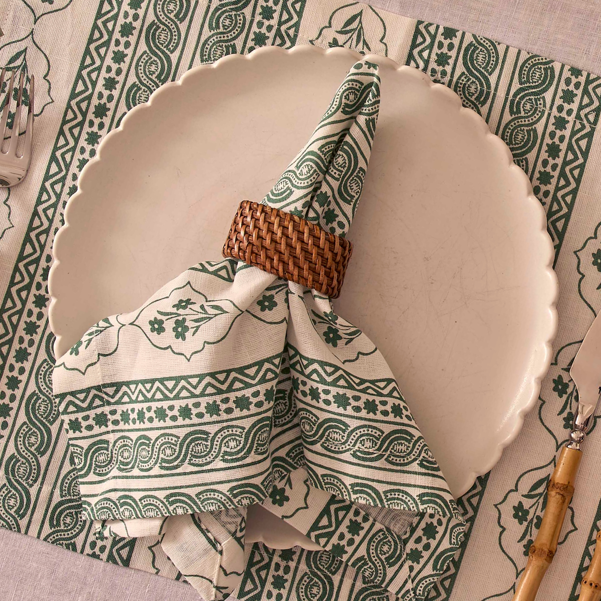 Inspired by the opulence of Mughal florals and intricate geometric patterns, our First Bloom napkins (set of 4) bring timeless artistry to the table. Hand screen printed by skilled artisans in Sanganer, Jaipur, in regal emerald green — each napkin is a modern celebration of centuries-old techniques.