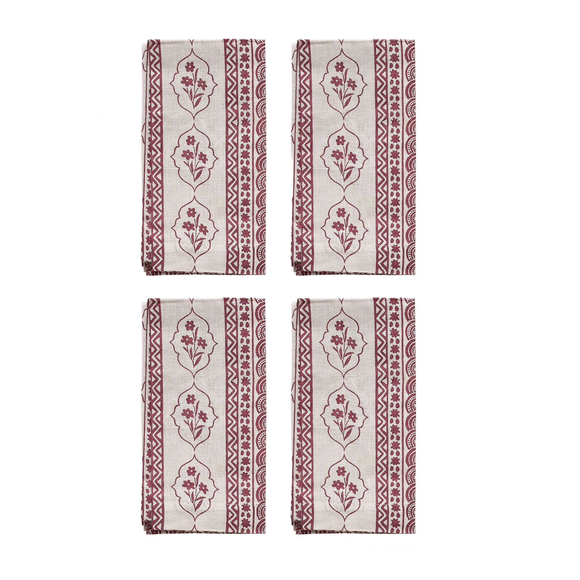 Inspired by the opulence of Mughal florals and intricate geometric patterns, our First Bloom napkins (set of 4) bring timeless artistry to the table. Hand screen printed by skilled artisans in Sanganer, Jaipur, in a deep ruby red — each napkin is a modern celebration of centuries-old techniques.